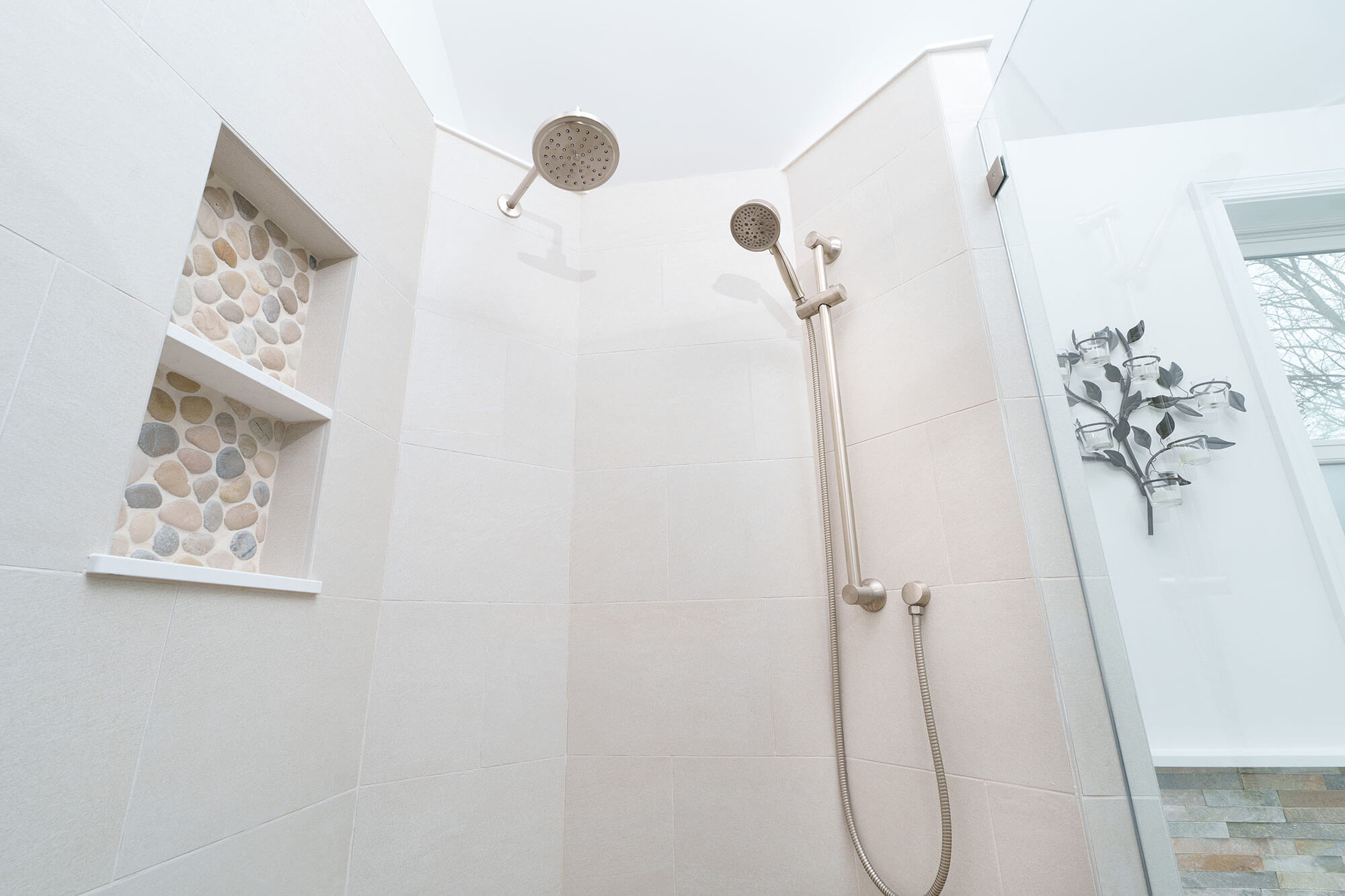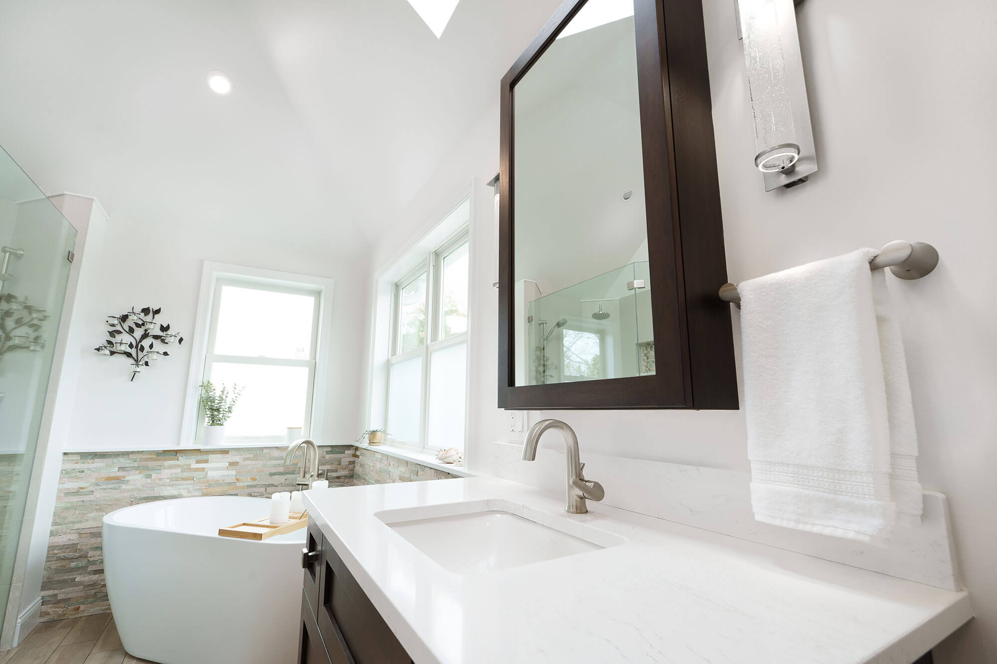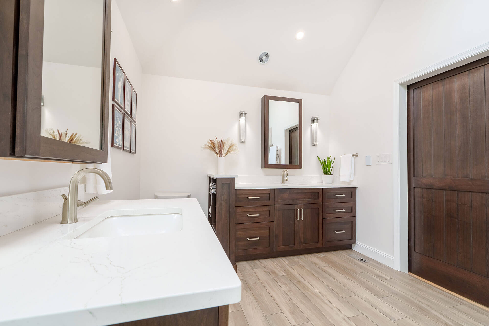 The marriage of warm woods and white-on-white-on-white in cabinetry, countertops and tile allows nature to play a role in this space. |