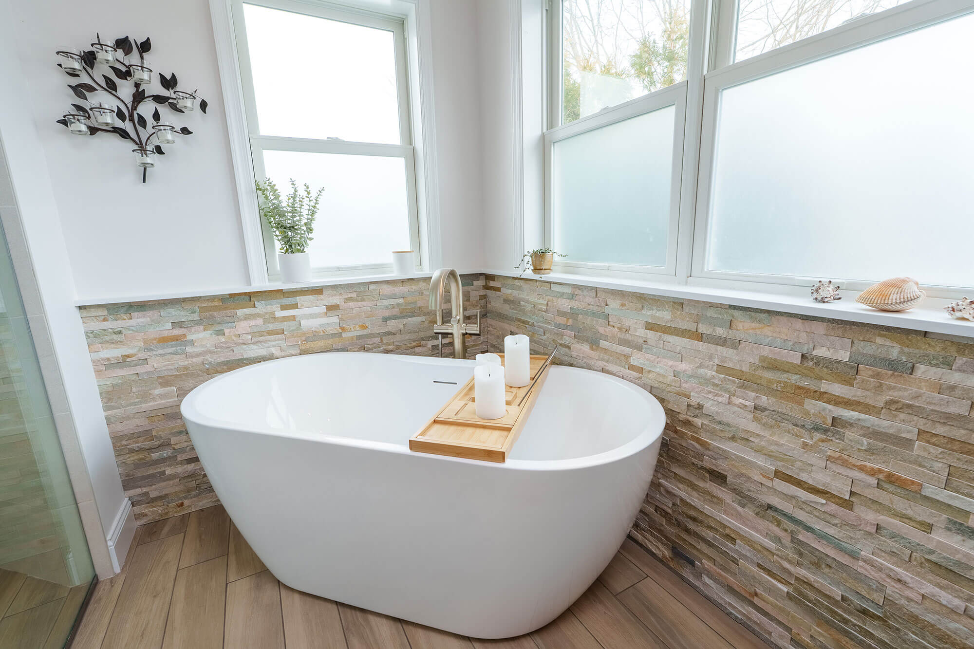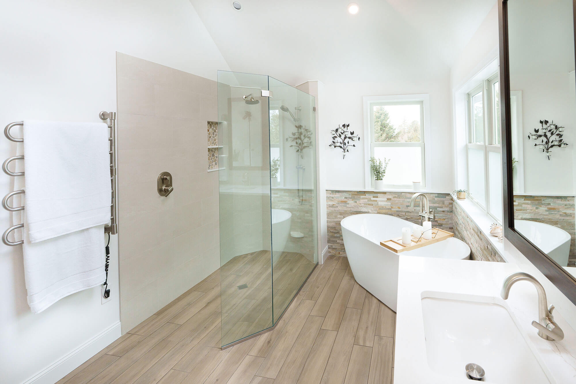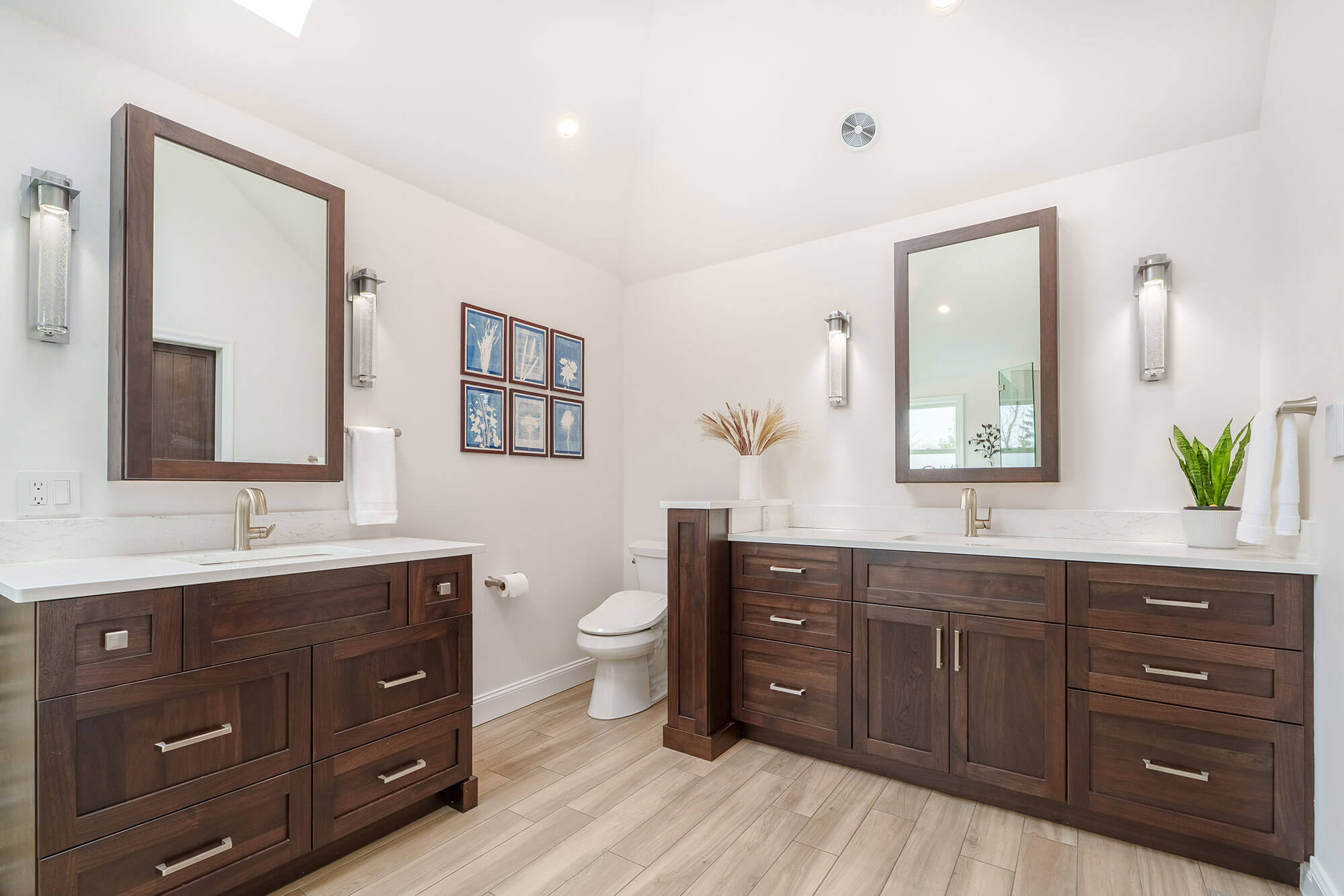 The marriage of warm woods and white-on-white-on-white in cabinetry, countertops and tile allows nature to play a role in this space. |