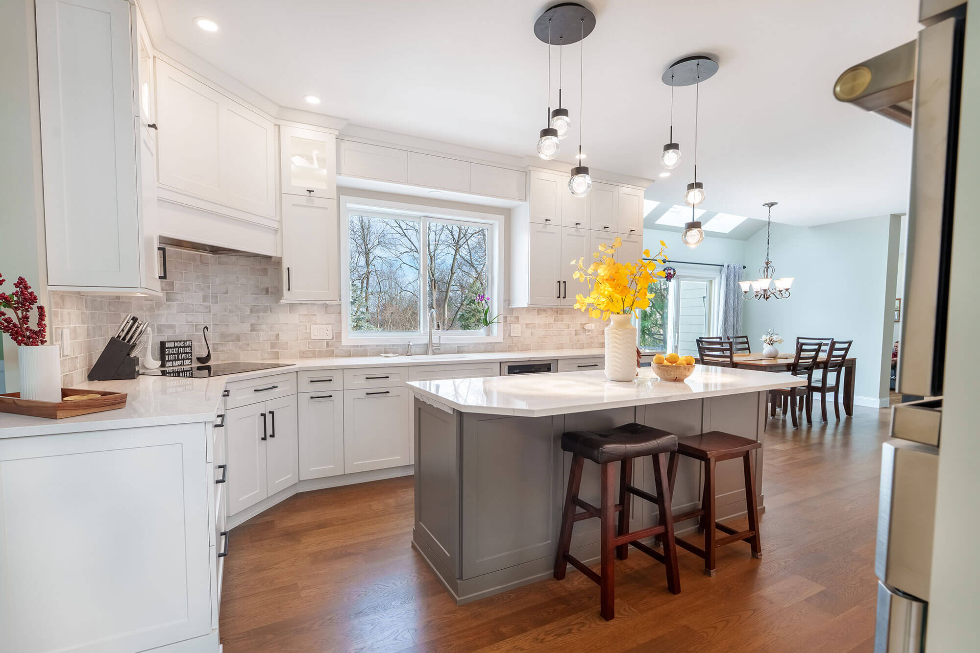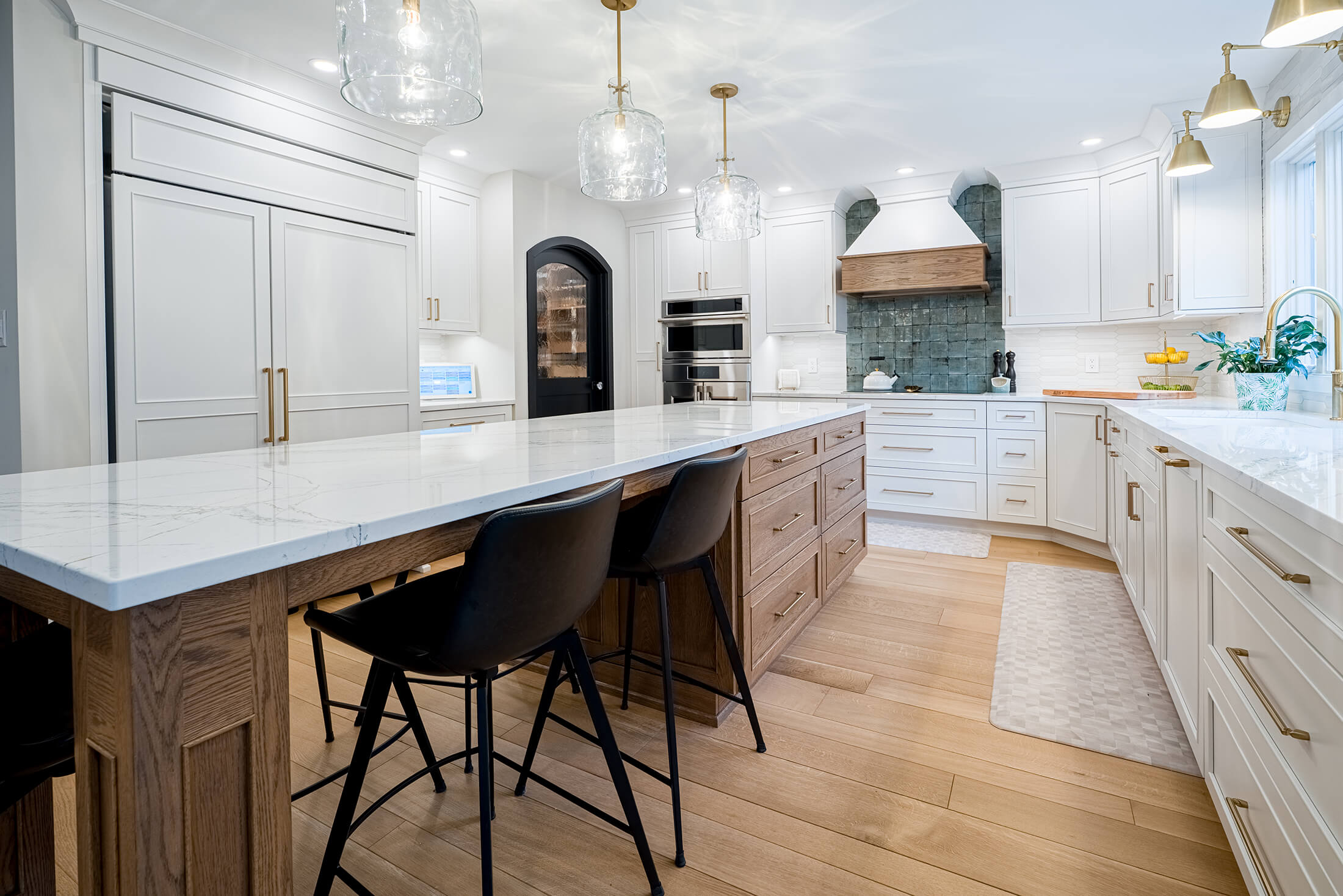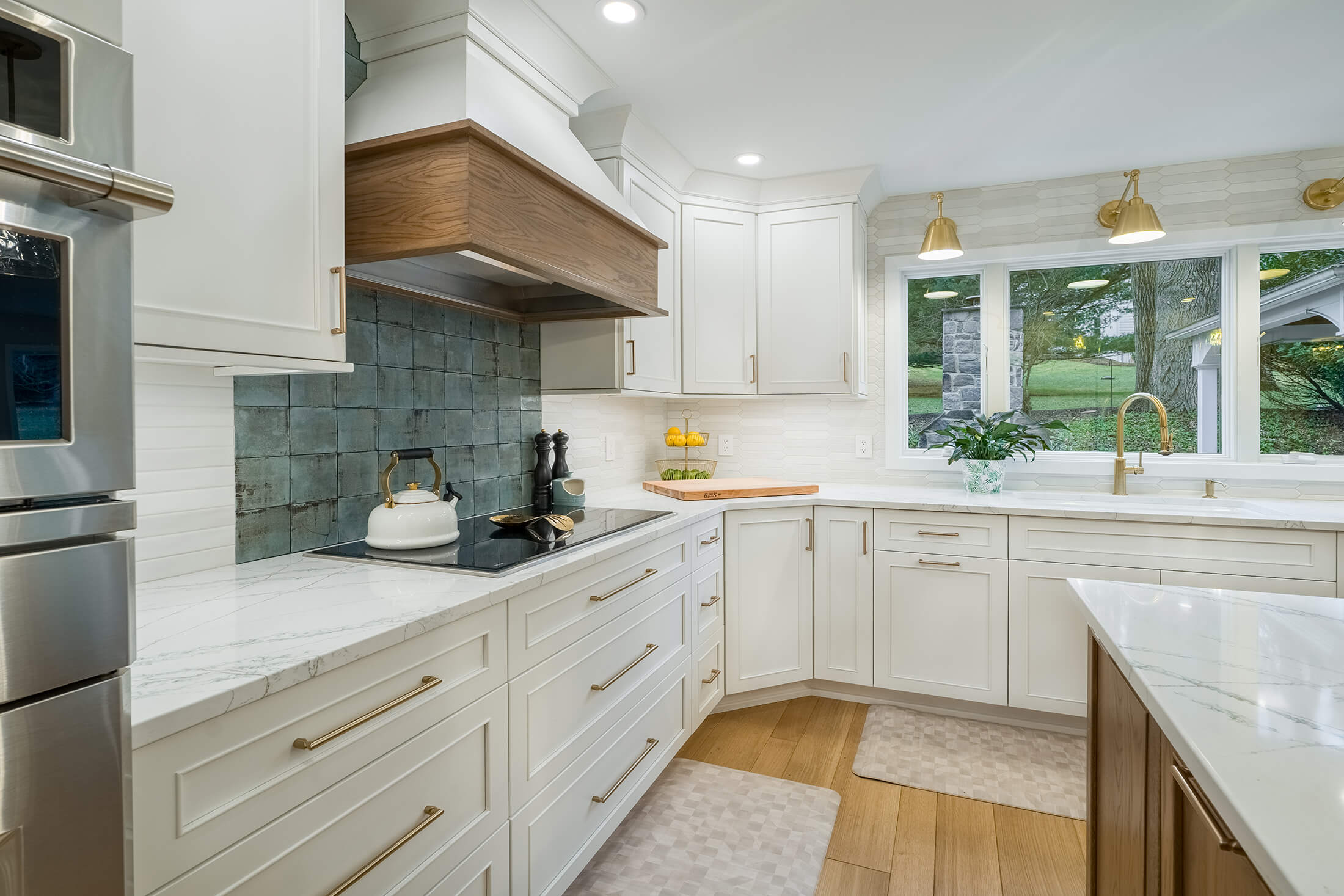 This Malvern kitchen and adjoining living spaces remodel by the Dilworth team pairs clean white cabinetry with natural wood tones and crafted tile accents. |