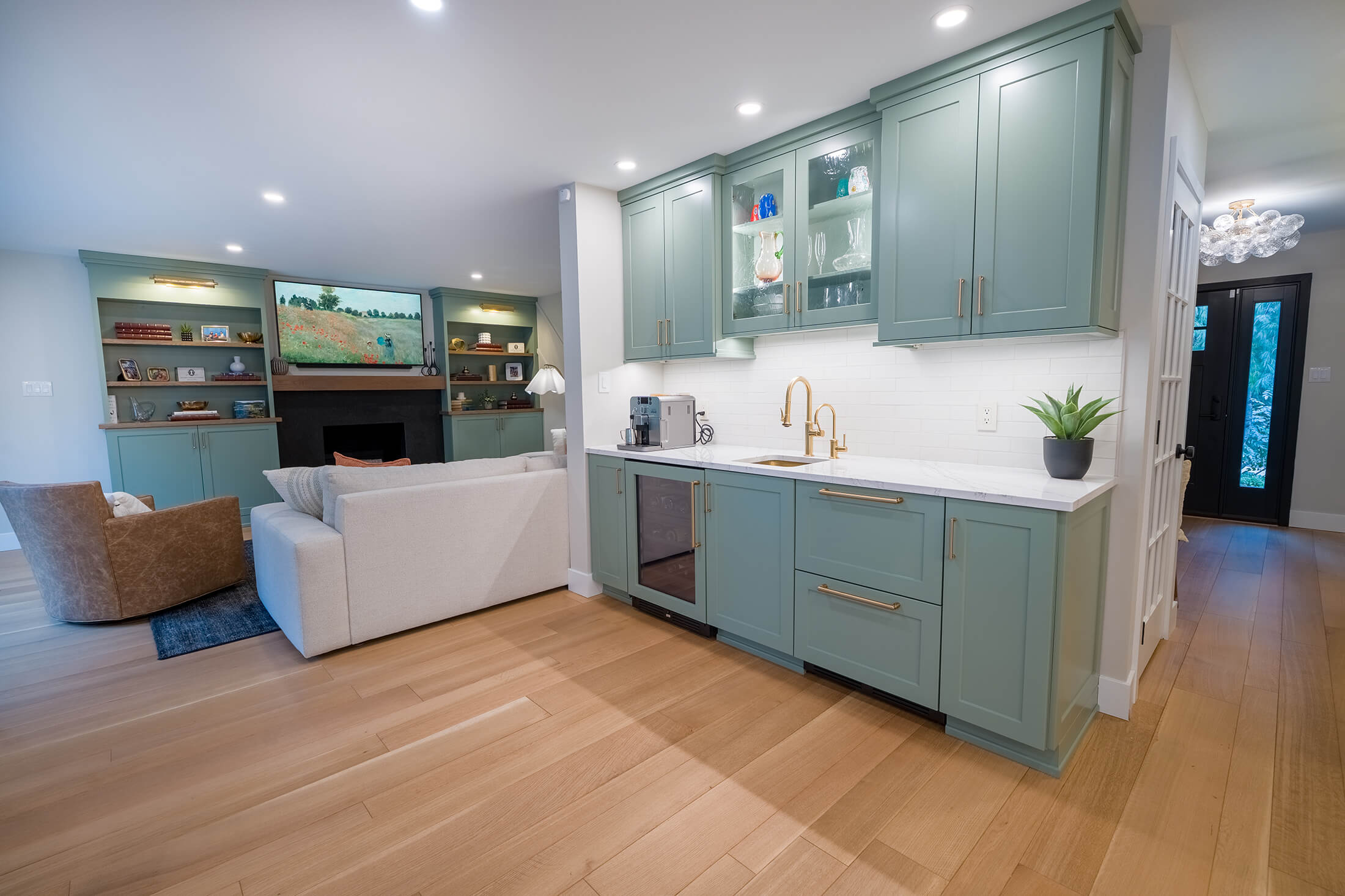Stunning transitional cabinets painted in calm with Taj Mahal Quartzite counter tops. The large island features a black walnut top. Accents topping off the space are Ashbury Pebble Crackle backsplash, copper bar sink & glass front cabinets. |
