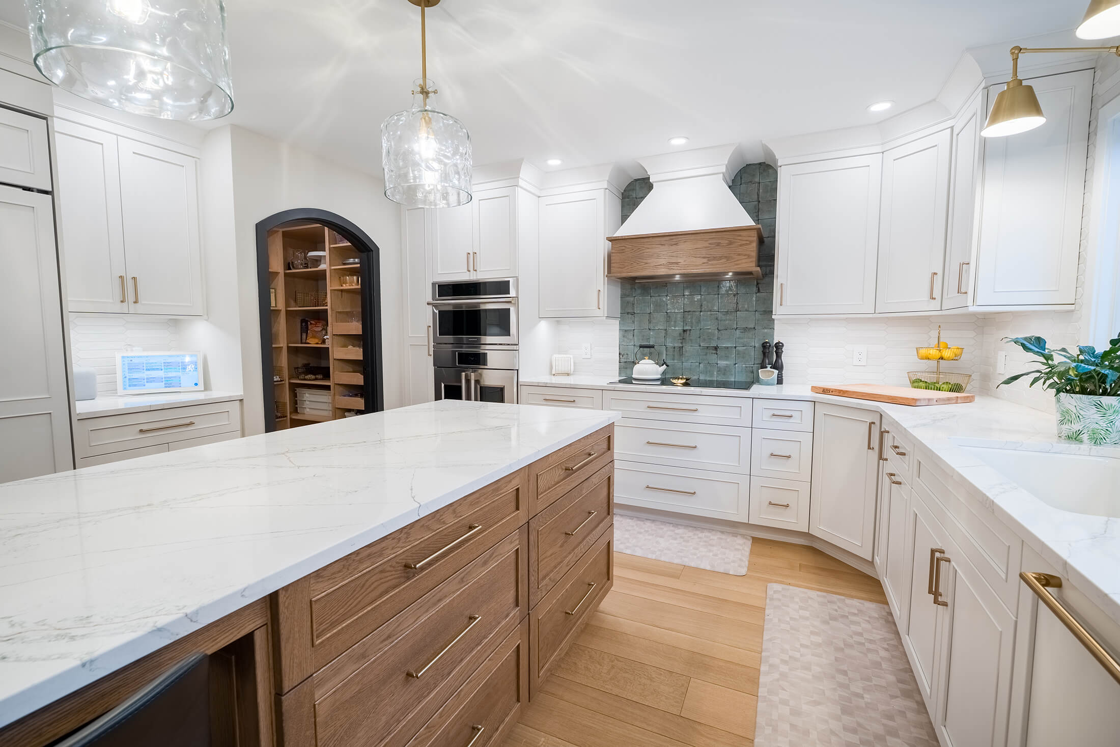 This blush island is surrounded by exquisite natural walnut perimeter cabinets, topped with quartz countertops. A Poitiers pearl backsplash finishes off this space perfectly. |