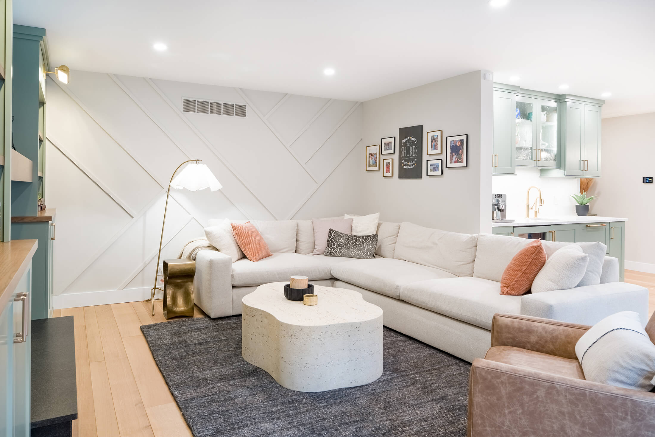 Truly a WOW kitchen! The full overlay cabinets are painted in Calm, beautifully accented with Concrete Carrara Quartz countertops and subway tile backsplash. Inside the frame over the cooktop, you will see Arabesque/Lantern mosaic tile for a subtle and elegant variation. The ledgestone accent wall at the bar is a unique touch. |