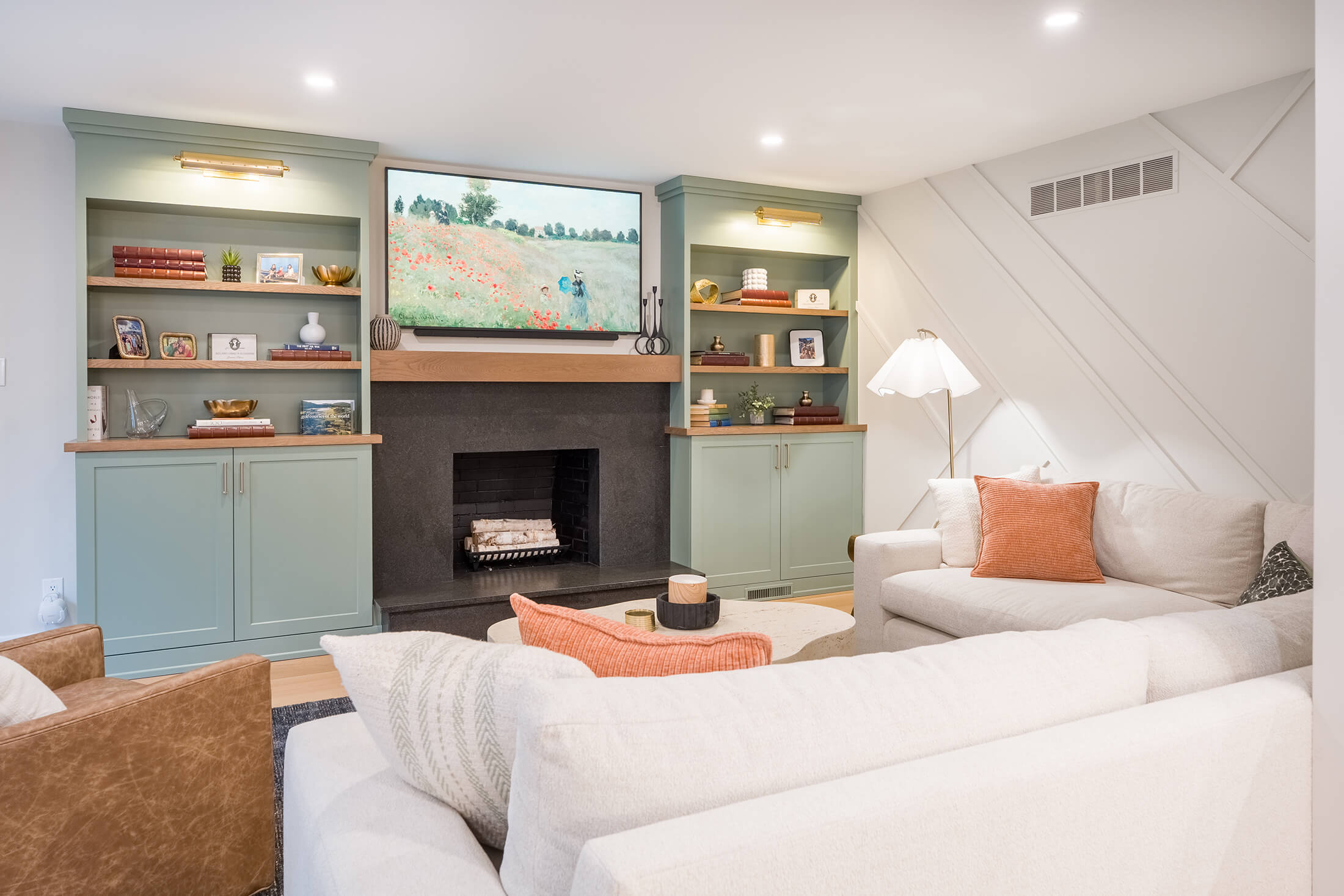 Mossy Oak quartz countertops blend beautifully with the ivory glazed cabinetry and black timeworn island. Subway tile in a pearl finish and refinished hardwood flooring are the perfect complements. Appliances are concealed with custom panels, and the island provides seating as well as a second sink for easy multi-tasking. Glass cabinetry and open shelving provide space for displaying books and collectibles. |