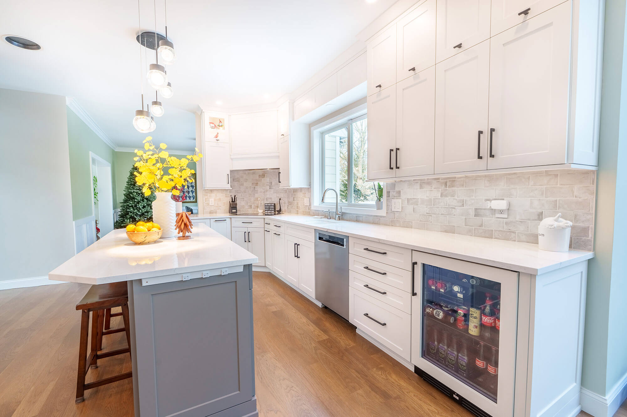 Inset cabinetry with the perimeter pained in Calm, the island is white oak stained Shipwreck. The beautiful hardwood flooring in 5" red oak really warms up the space. Zodiaq quartz countertops and subway tile backsplash give a clean, minimalist look to this kitchen. |