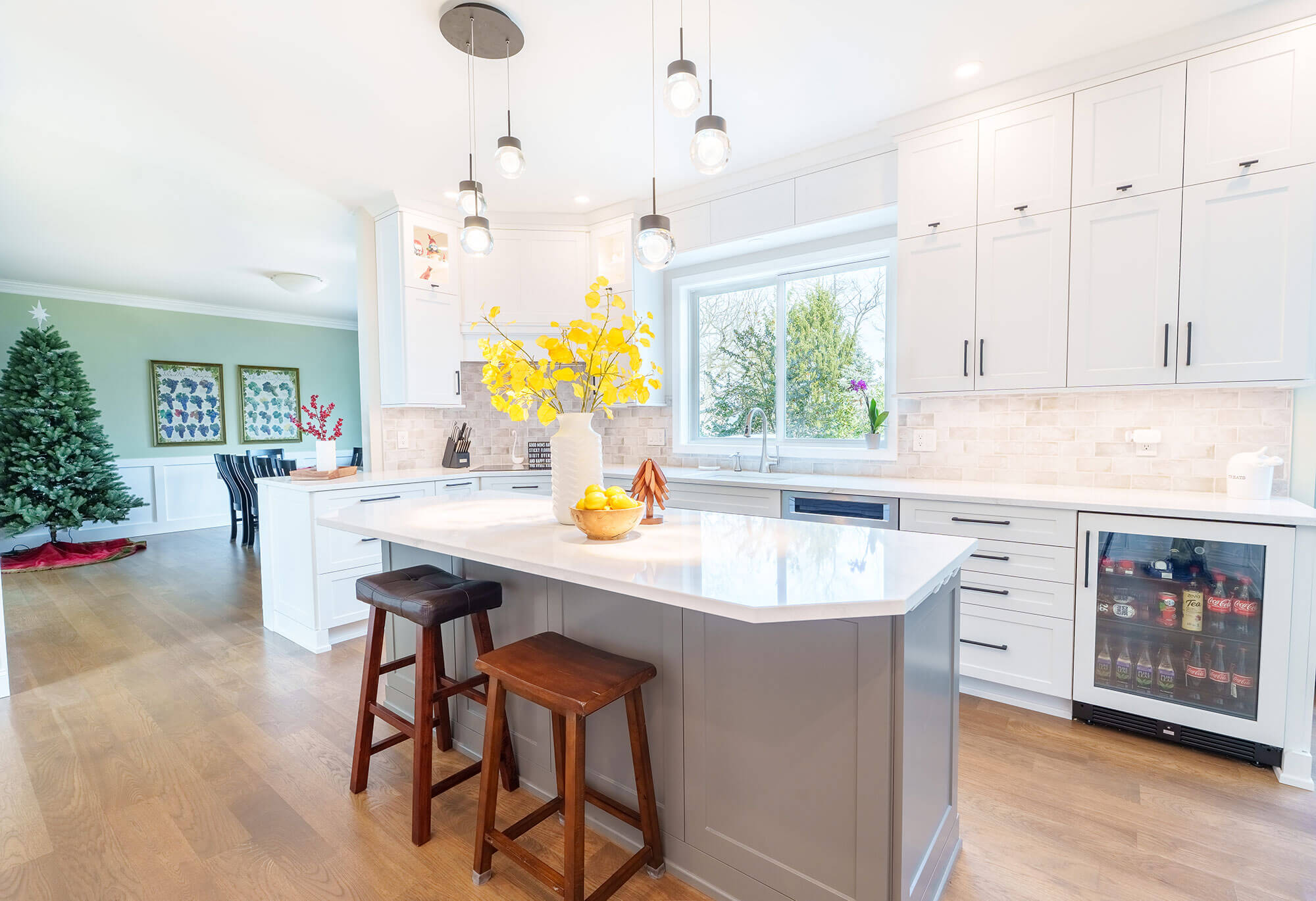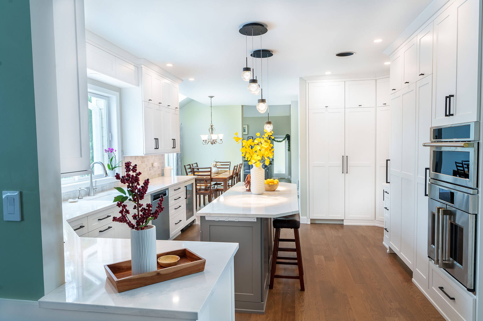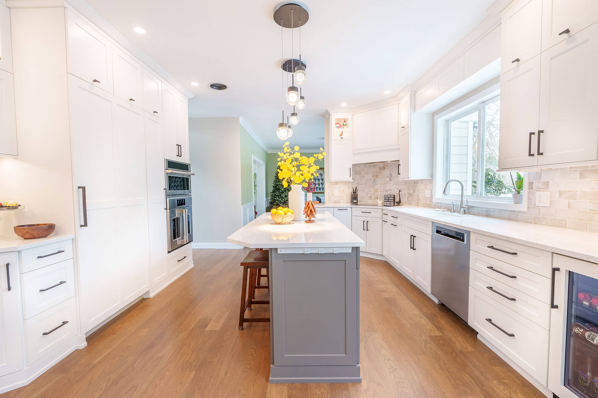 An open concept kitchen flanked in Dilworth’s Snowbound Colonial cabinetry is a welcoming breath of fresh air every time one enters the room! Spending time cooking, dining and gathering in this new space is always a pleasure. This clean, country kitchen is a spacious improvement from the original with plenty of light and storage. |